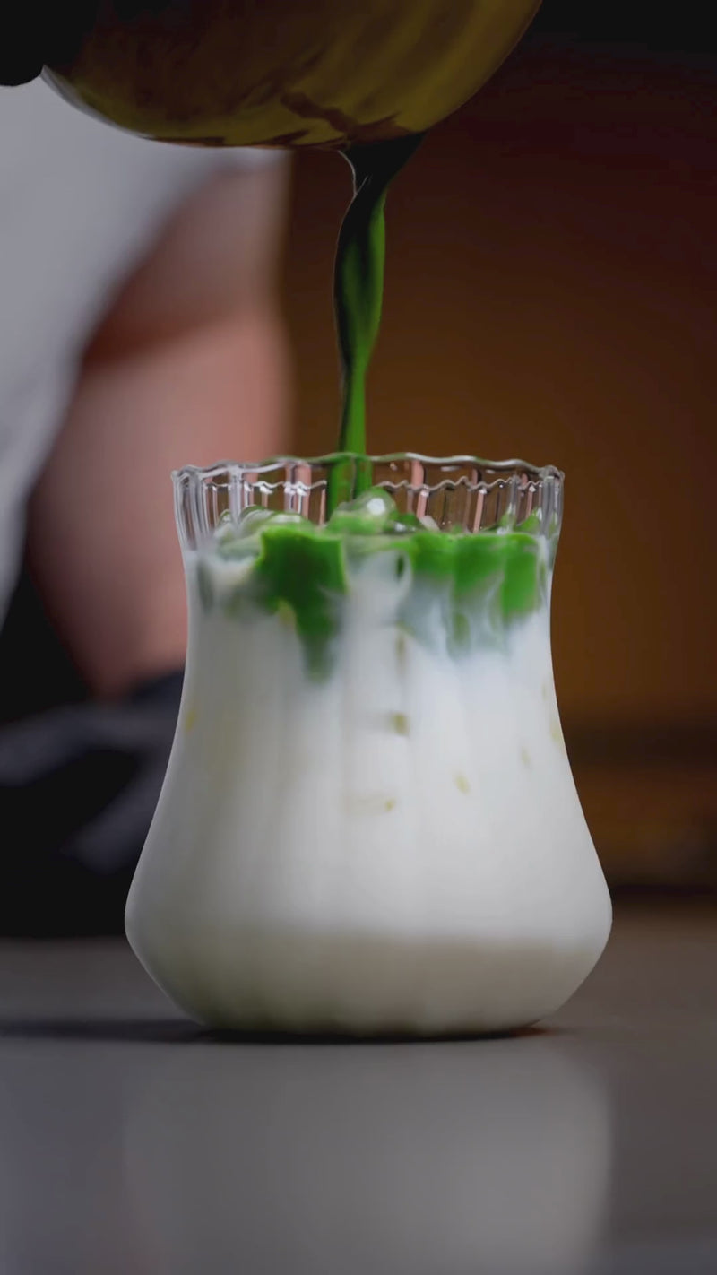 Slowly pour the prepared matcha over the milk for a layered presentation. Stir gently before drinking and enjoy immediately.